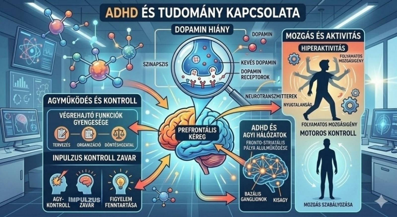 Az ADHD-s agy dopamin és noradrenalin rendszereiben mutat eltéréseket, ami a figyelem és az impulzuskontroll szabályozását befolyásolja. Emiatt nehéz lehet a hosszú távú fókusz, a rutin feladatok elvégzése, vagy a stressz kezelése.